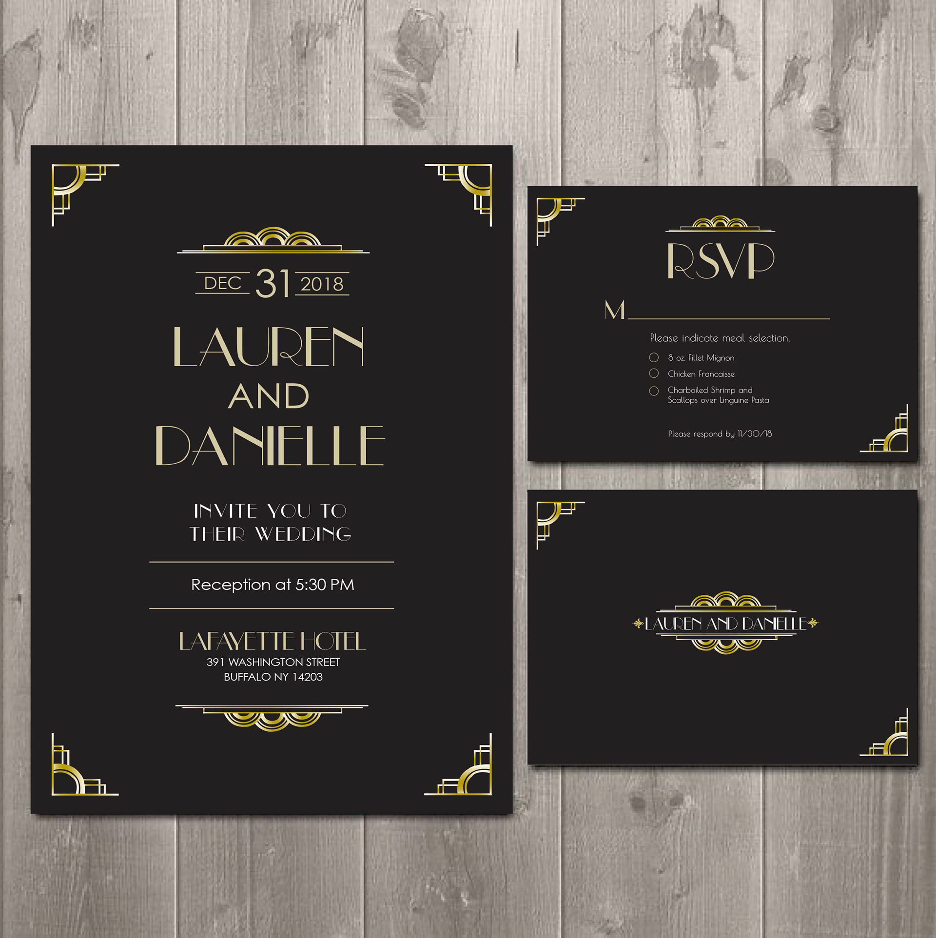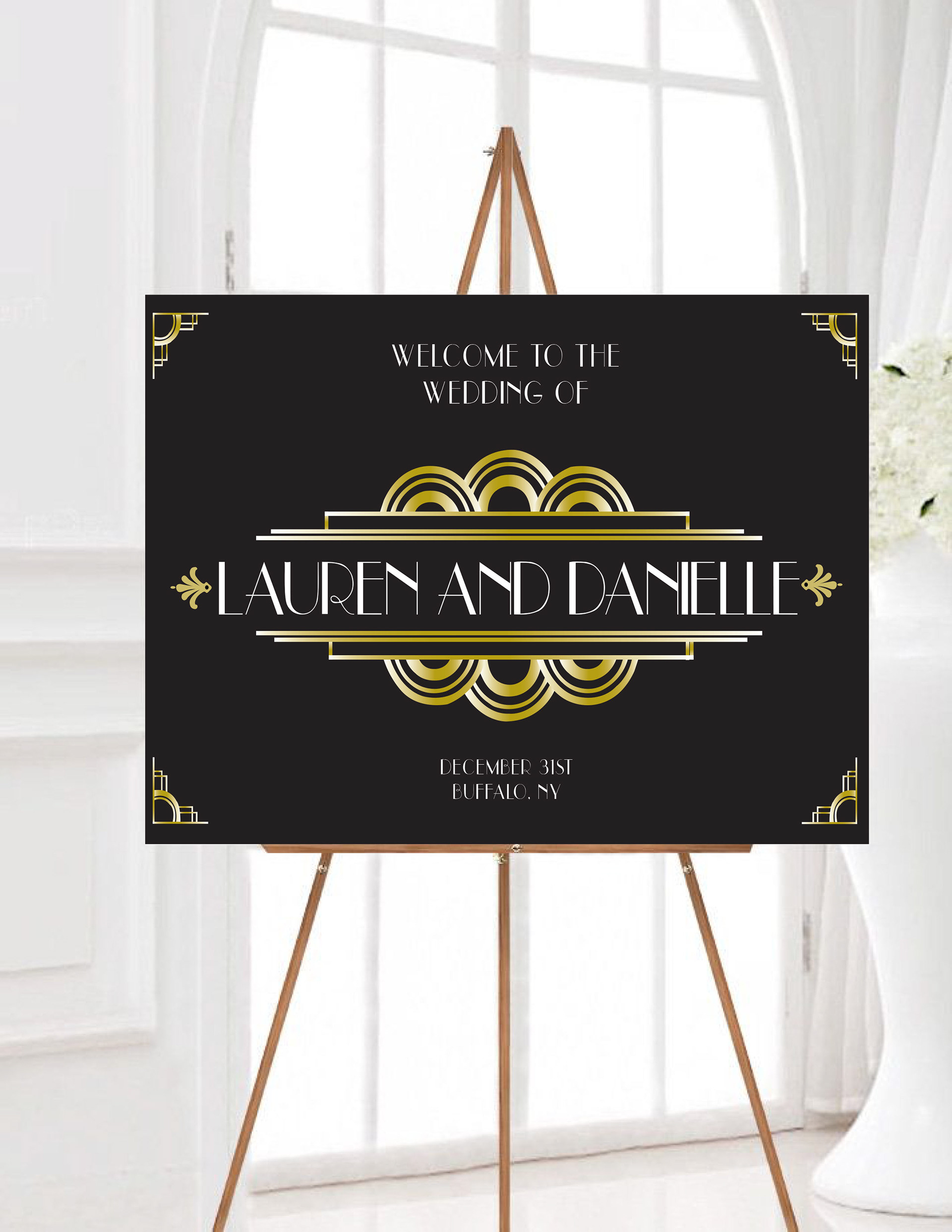 This great gatsby inspired design for a New Years Eve wedding, included an invitation, RSVP, and a welcome sign at the wedding reception.