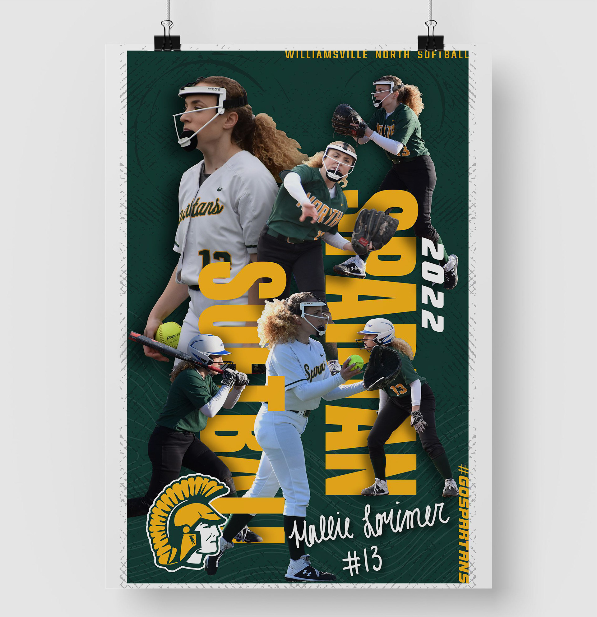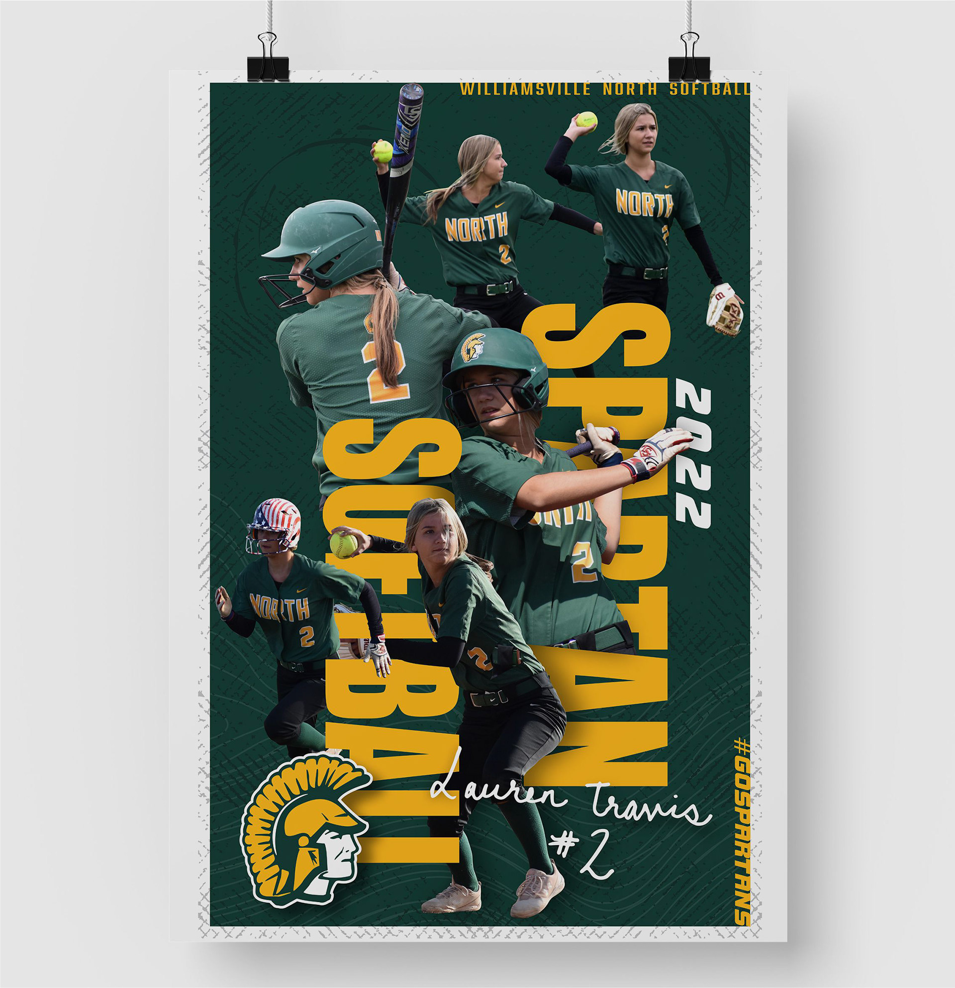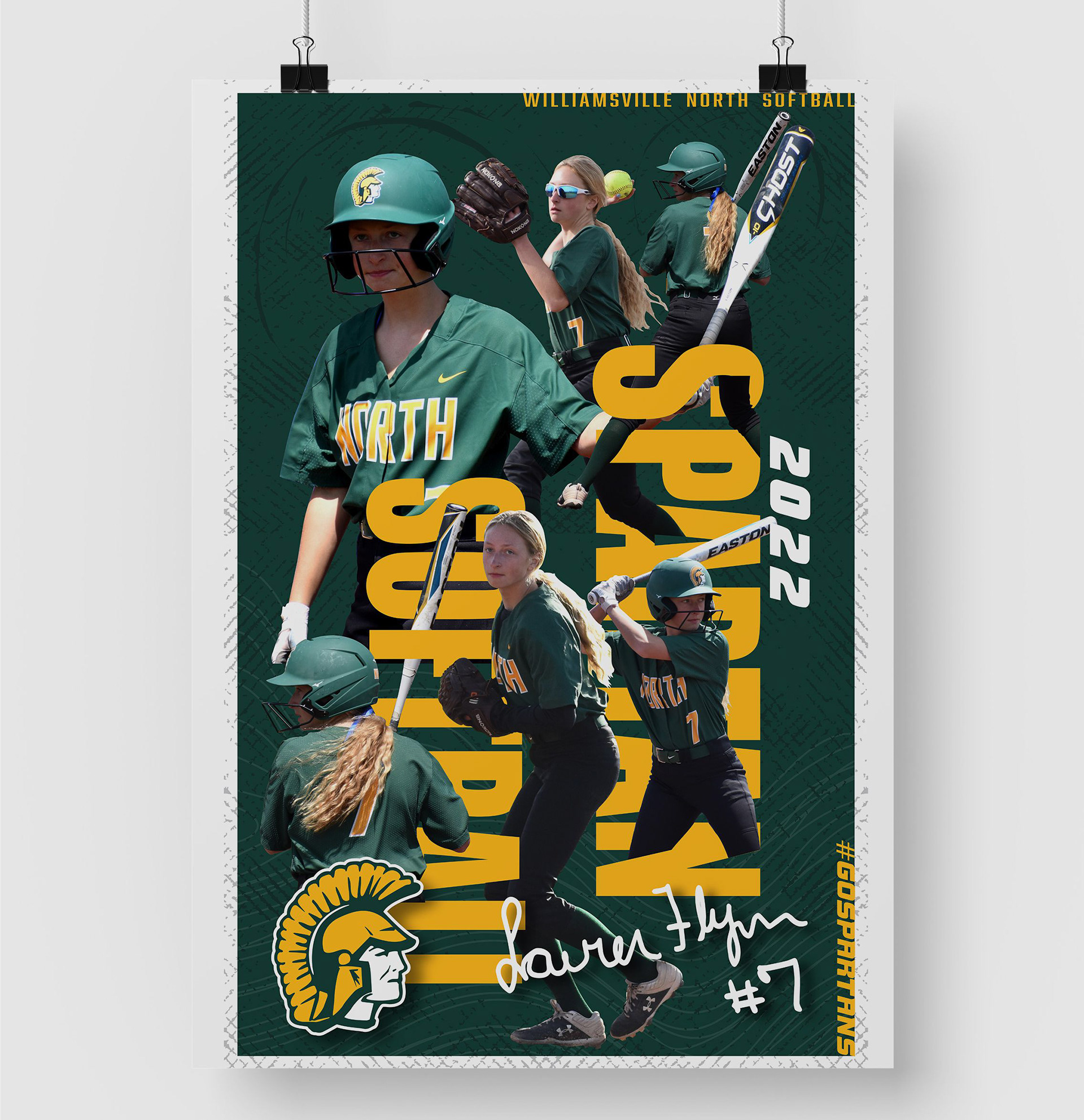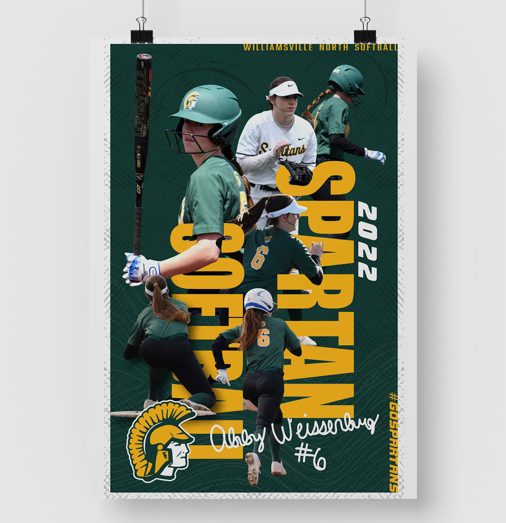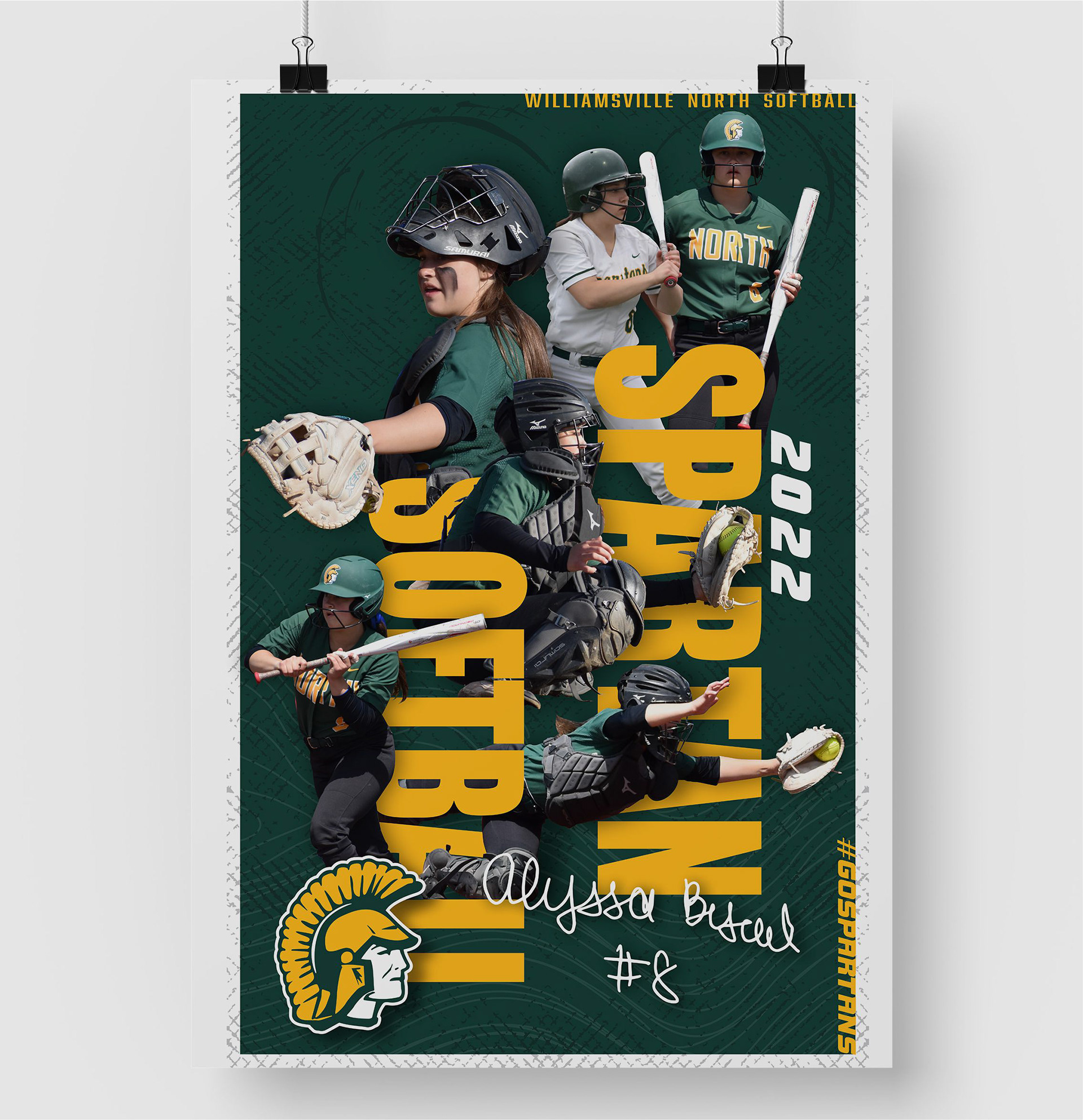These banners were created to highlight each senior on the Williamsville North Softball Team. Each banner was 24' wide x 36' tall, and hung on the back dugout fence on the players senior day game.